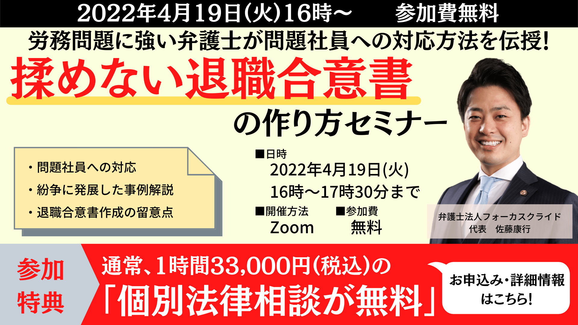通常、有料(1時間33,000円(税込))のところ、セミナーにご参加いただいた方々には経験豊富な弁護士による個別相談を無料でお付けいたします。