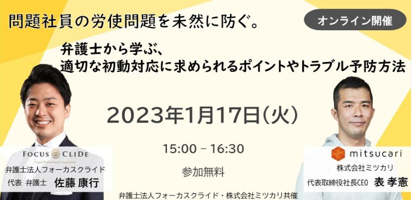今回のセミナーでは、多くの企業での労務問題を解決し、「紛争法務・予防法務」だけでなく「成長戦略法務」の支援を得意としている弁護士法人フォーカスクライドの代表 弁護士 佐藤 康行氏から、問題社員に対する適切な初動対応や実施のポイント、事前に準備すべきことについてお話頂きます。その後、人材の行動原理や意思決定に大きく影響を与えている性格・価値観について27万人以上のデータを収集・分析し、多くの企業における離職率やコミュニケーション課題を解決してきたミツカリの代表取締役社長CEO 表 孝憲氏から問題社員の発生をどのようにすれば予防できるのかについてお話いたします。